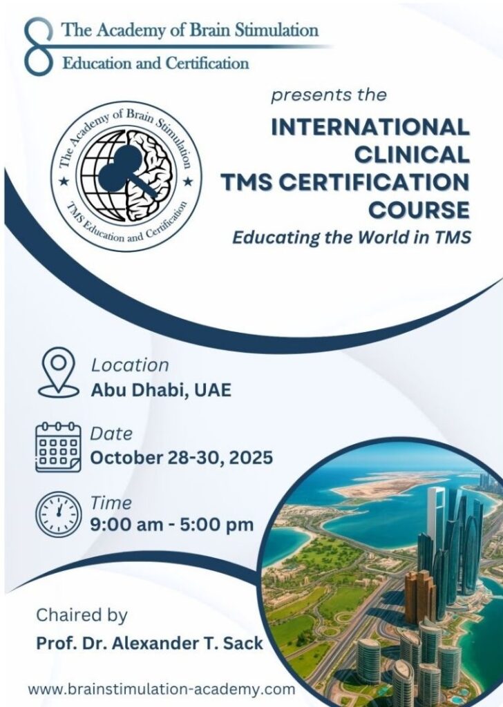 دورۀ بین‌المللی Clinical TMS Certification Course 2025 با حضور جمعی از متخصصان برجستۀ علوم اعصاب و روان‌پزشکی، ۲۸، ۲۹ و ۳۰ اکتبر ۲۰۲۵ در شهر ابوظبی – امارات متحده عربی برگزار شد. این برنامه آموزشی سه‌روزه با محوریت نورومدولاسیون و تحریک مغناطیسی فراجمجمه‌ای (TMS) شامل آموزش‌های نظری و کارگاه‌های عملی فشرده بود و شرکت‌کنندگان فرصت یافتند جدیدترین استانداردهای بالینی درمان با TMS را به‌صورت کاربردی تجربه کنند.